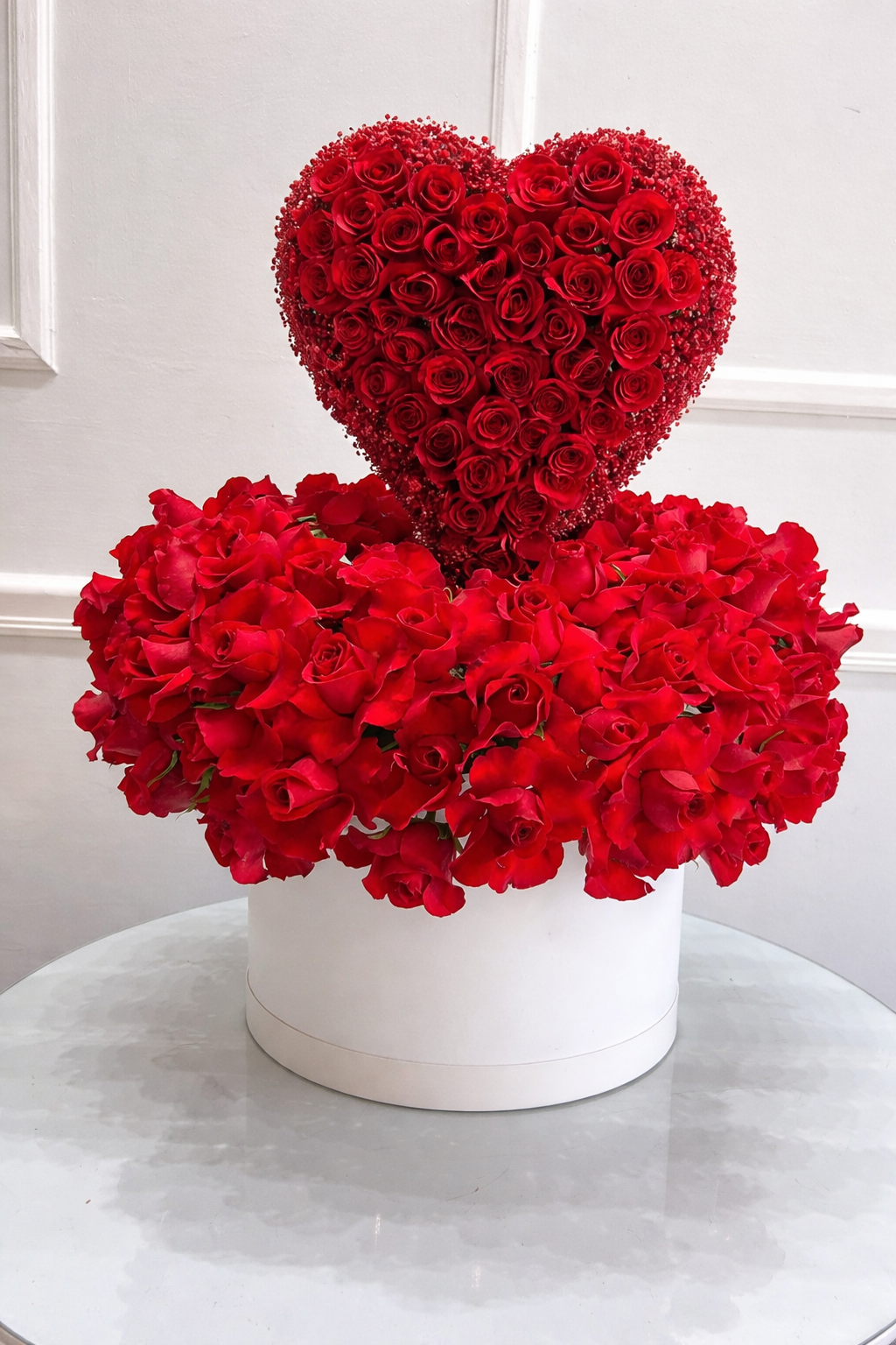 Cajá circular blanca 30 cm con rosas abiertas y escultura de corazón con gypsophila