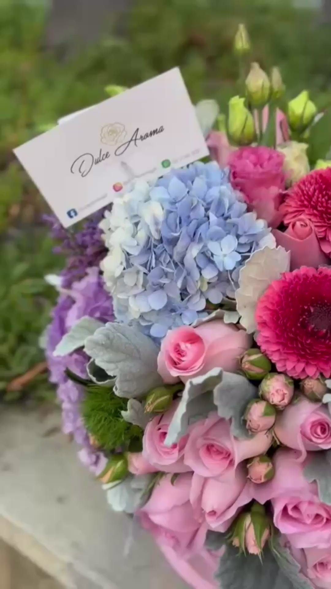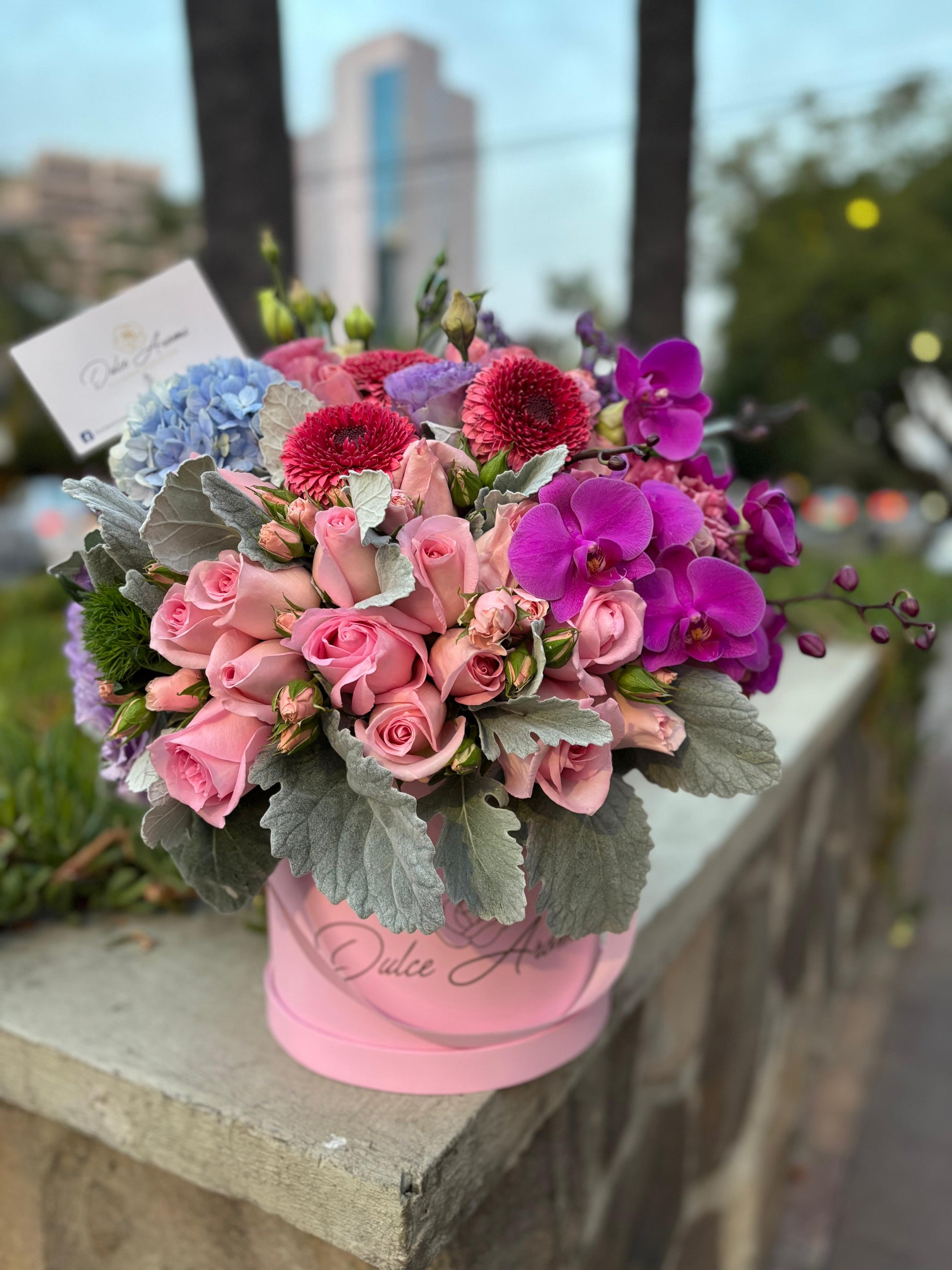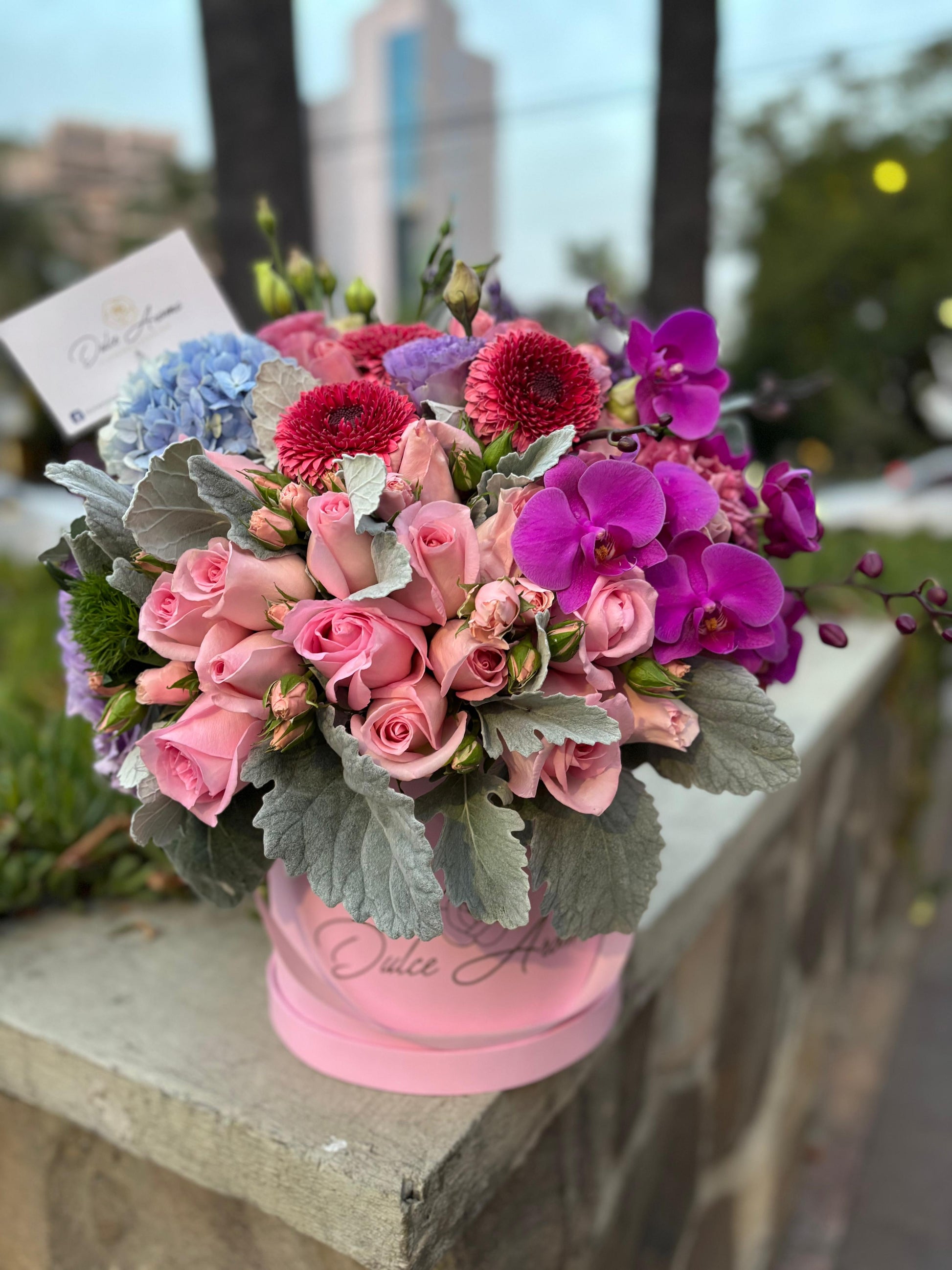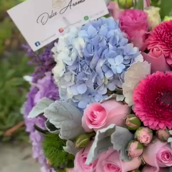 Media esfera cilindro 20 cm rosa, con rosas, hortensias, dalias y follaje
