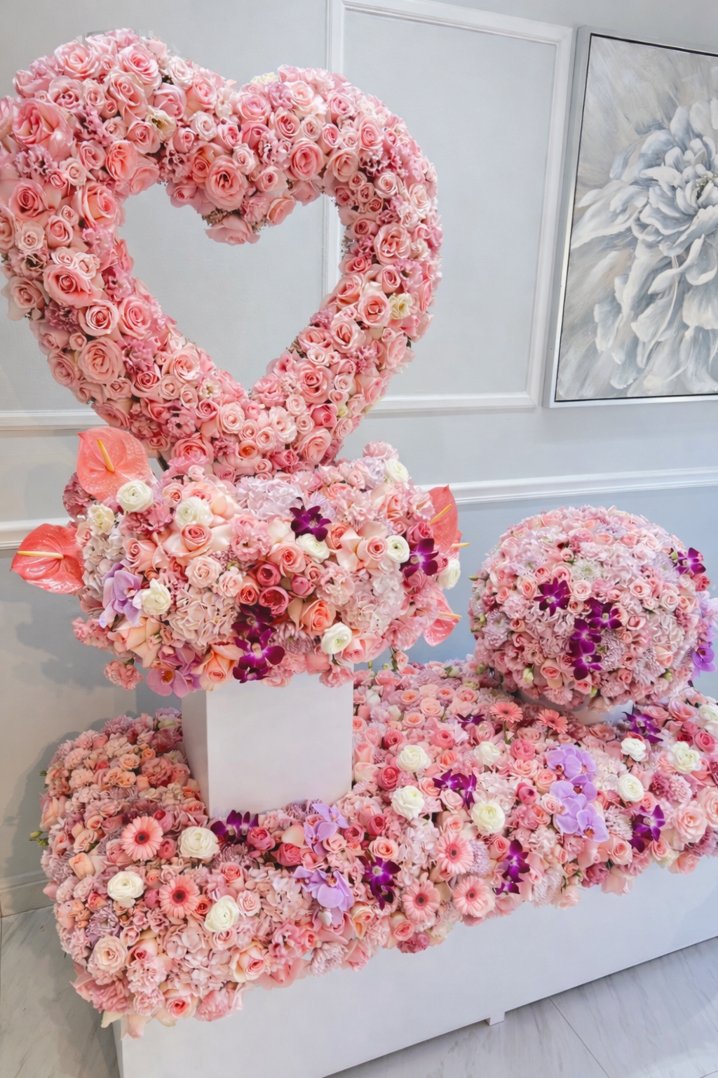 Diseño en varios niveles con flores finas, mini gerberas, rosas, anturios, orquídeas entre otras