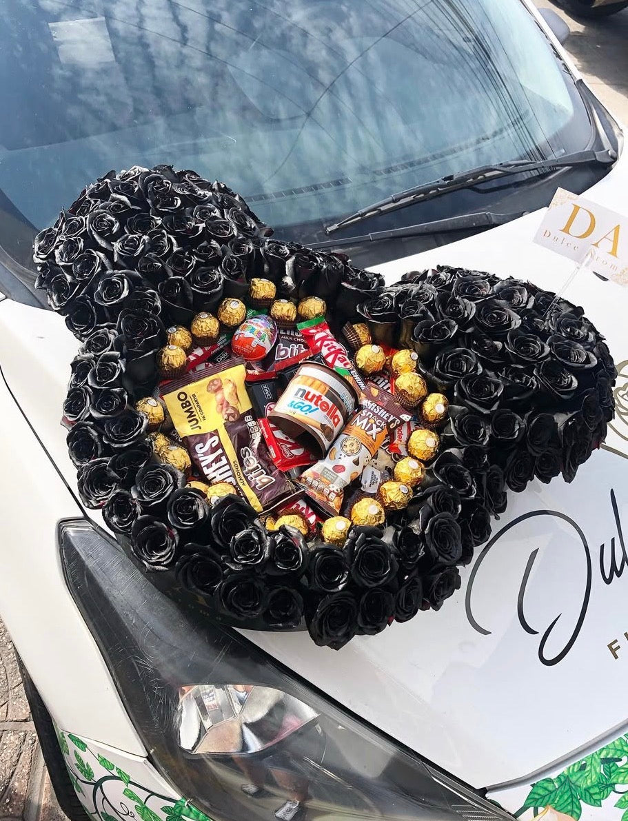 Caja de Mickey con contorno de rosas negras en 3D y en el centro dulces surtidos