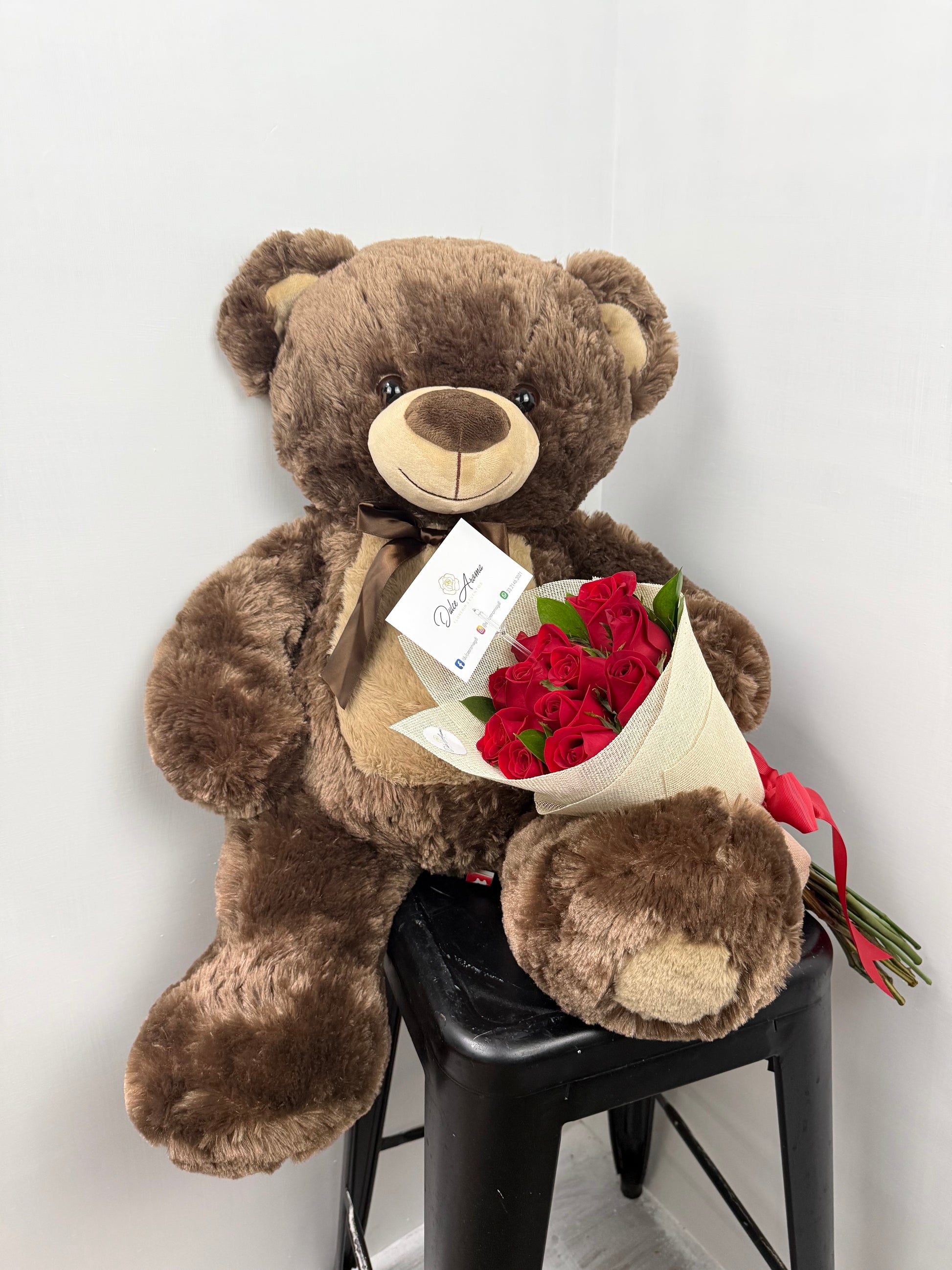Ramo 12 rosas y oso de peluche 50 cm