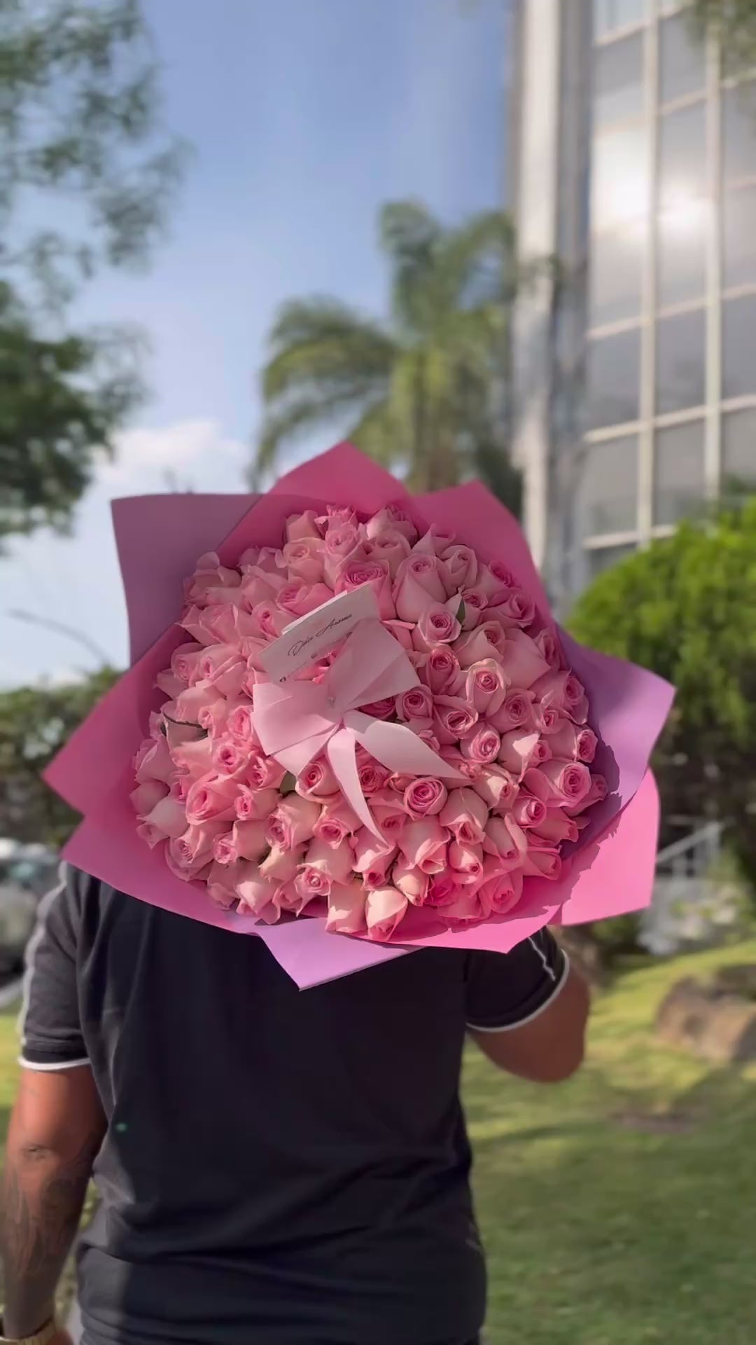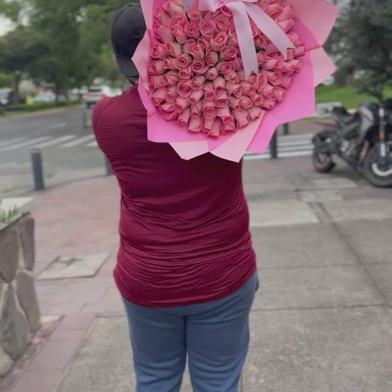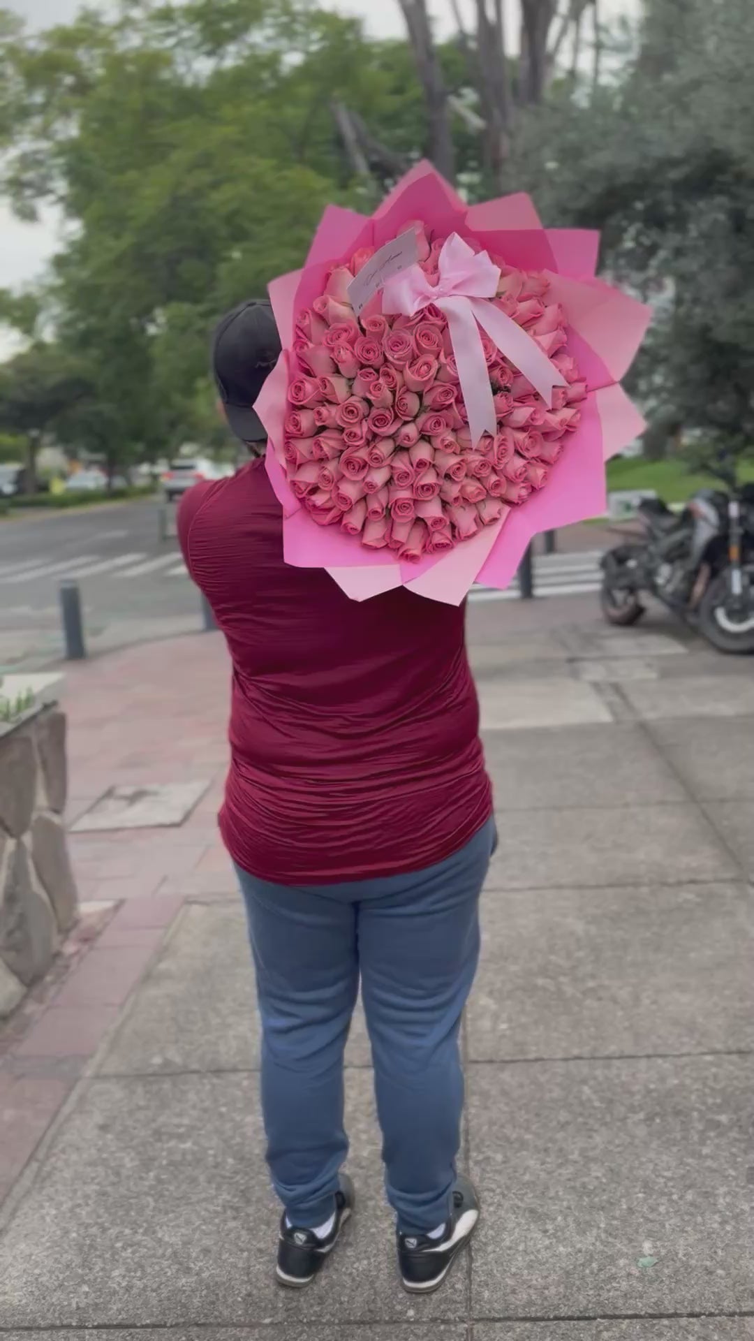 Ramo 100 rosas rositas envoltura rosa moño decorativo