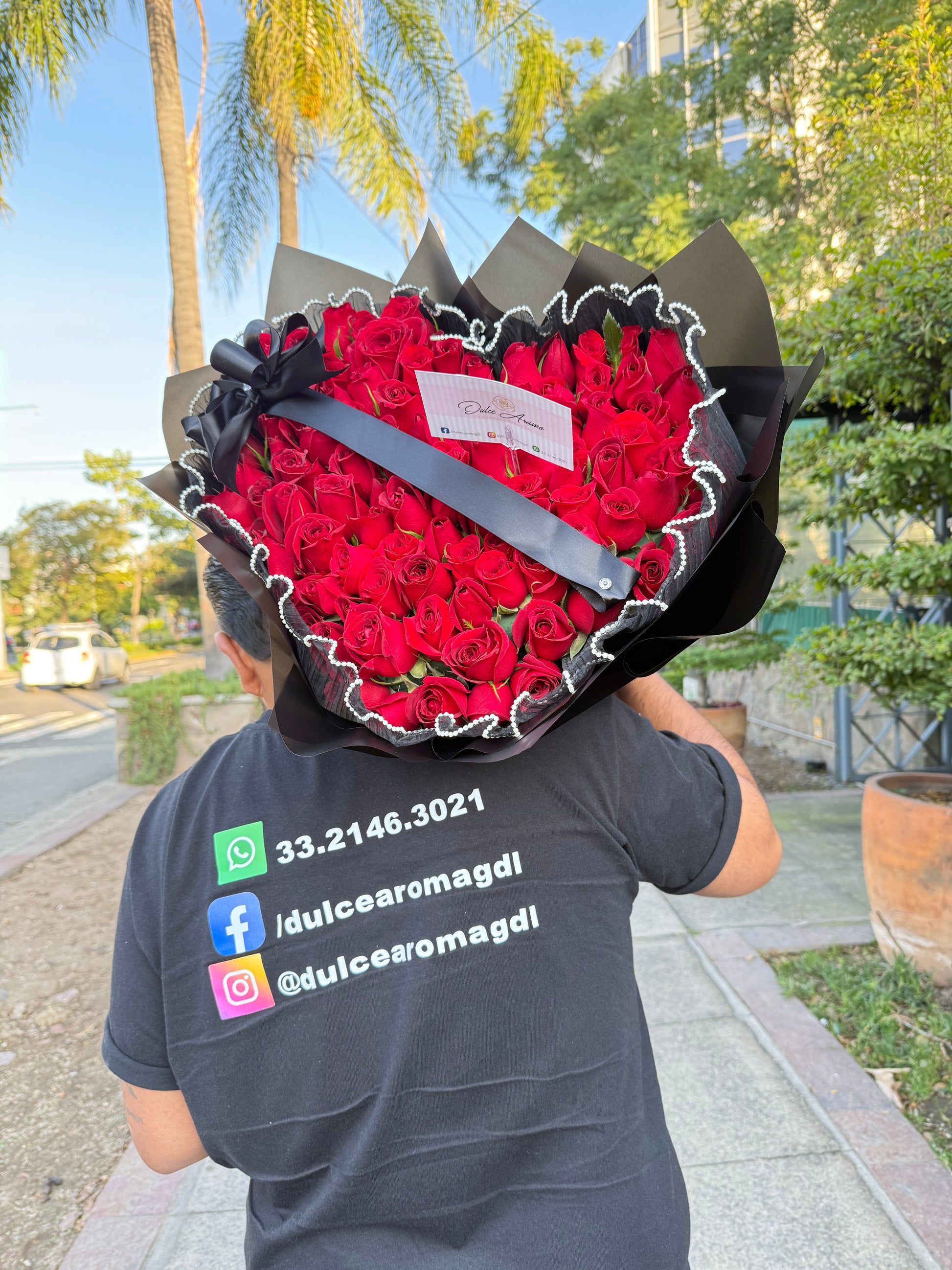 Ramo 100 rosas en forma de corazón con envoltura especial negra