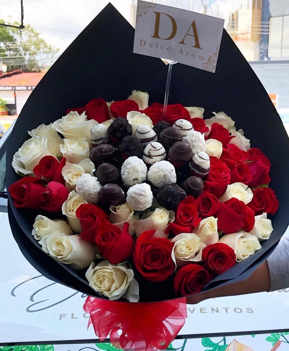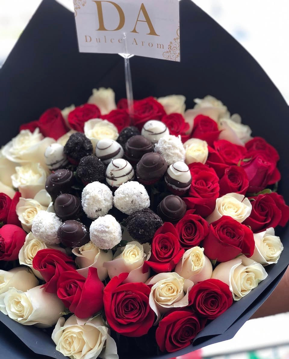 Ramo 50 rosas blancas y rojas con 20 fresas con chocolate